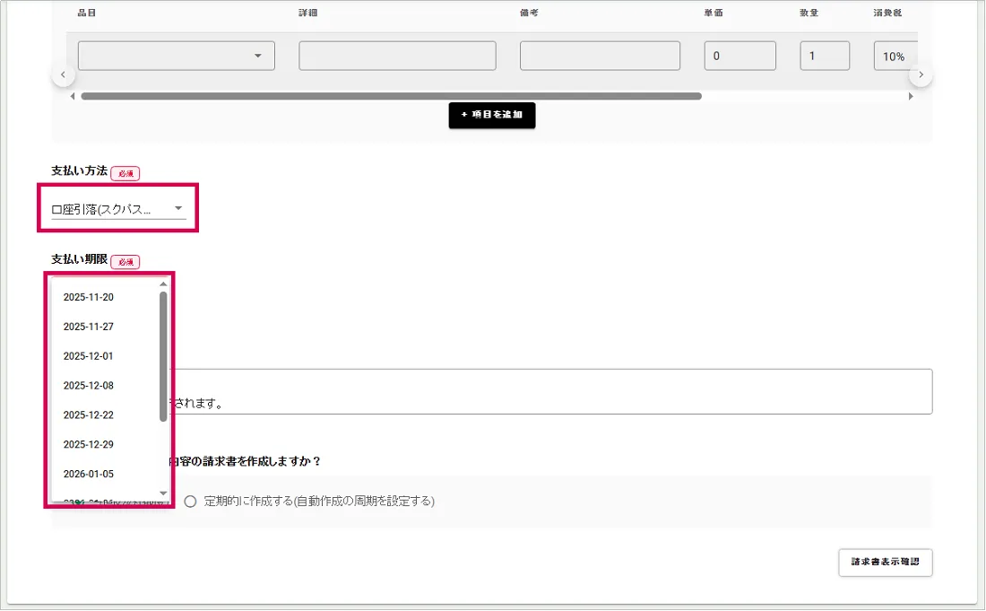 スクパスペイをご利用の方向けに請求書を作成する方法を説明します。支払い期限に選択できる日付が通常と異なります。