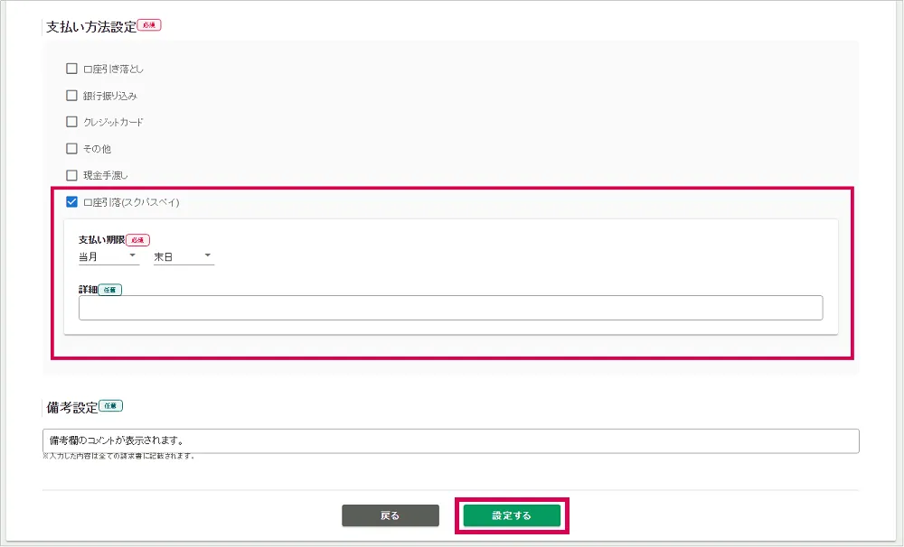 事前に、サイドメニュー「請求書>設定>請求情報設定」で、支払方法設定「口座引落(スクパスペイ)」にチェックを入れて、支払期限を設定しておく必要がございます。