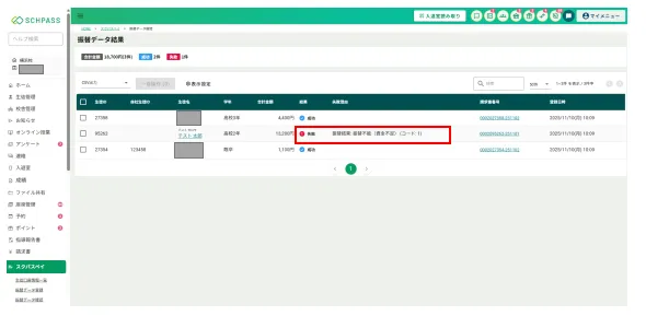 結果が「失敗」の場合は、理由を確認して保護者(生徒)様に対応をしてください。