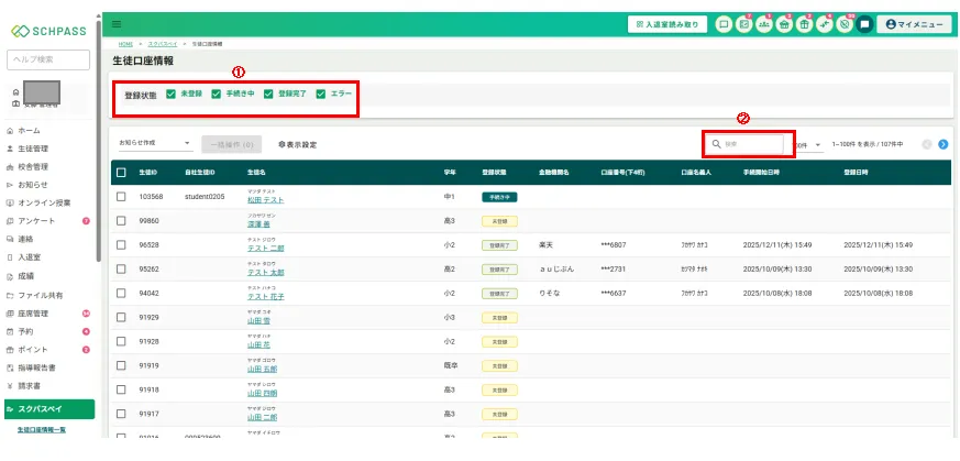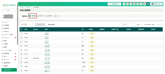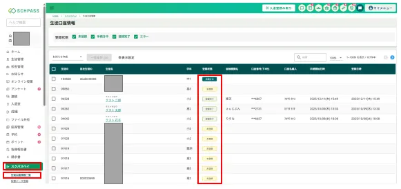 サイドメニュー「スクパスペイ」>「生徒口座情報一覧」をクリックし「生徒口座情報」画面の一覧で「登録状態」を確認することができます。