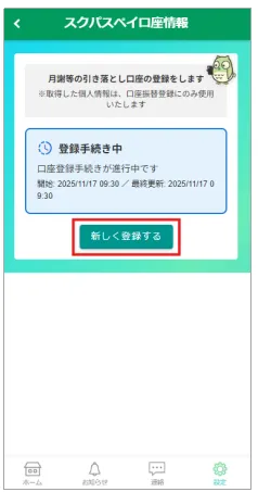 ユーザーが口座登録の手続きを開始し、登録完了待ちの状態。