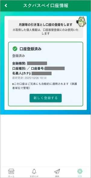 「設定」>「スクパスペイ口座情報」をタップし、口座情報を登録します。
