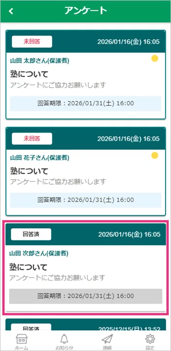 2.「回答済」のアンケートをタップ